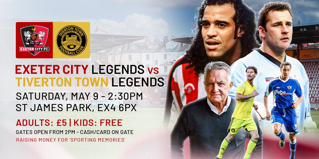 The annual Exeter City legends vs Tiverton Town legends game will take place at St James Park on Saturday, May 9 - 2:30pm.