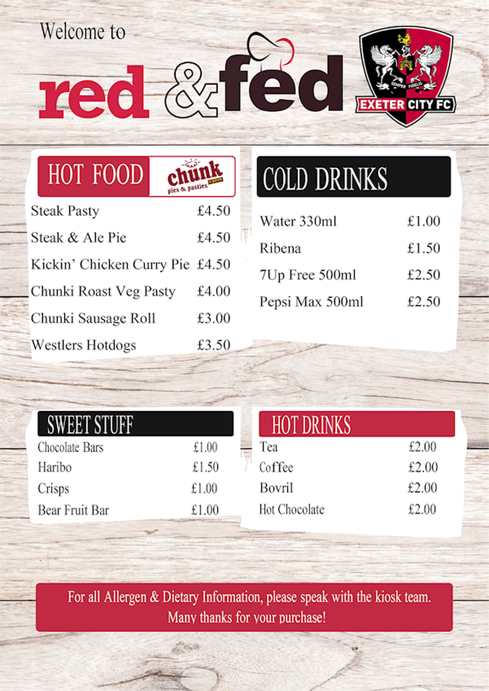 BARS: Away supporters are welcome to join us for pre-match drinks in the Centre Spot Bar, located inside ‘The Park’ building, accessed via the fan zone. Centre Spot is home and away fan friendly and serves beers, ciders, wines and spirits as well as selection of locally sourced pies and pasties. Inside Centre Spot there is also the FECRACE (Famous Exeter City Real Ale and Cider Emporium) which serves local beers and ciders and run by a group of volunteers.