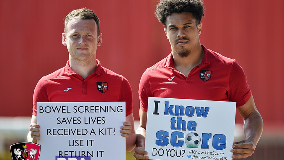 Exeter City Captain Jordan Moore-Taylor said: “Bowel cancer can affect anyone at any age so it's really important everyone is aware of the symptoms as early as possible. I am supporting Know the Score because it's great that football is coming together to raise awareness of the disease during Bowel Cancer Awareness Month.”