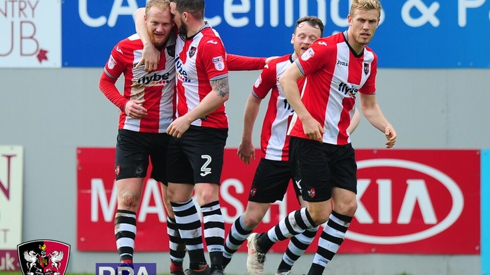 Exeter City: Pym, Sweeney, Woodman, James, Tillson, Simpson (Jay, 71), Stockley, Moxey, Taylor, Storey, Boateng