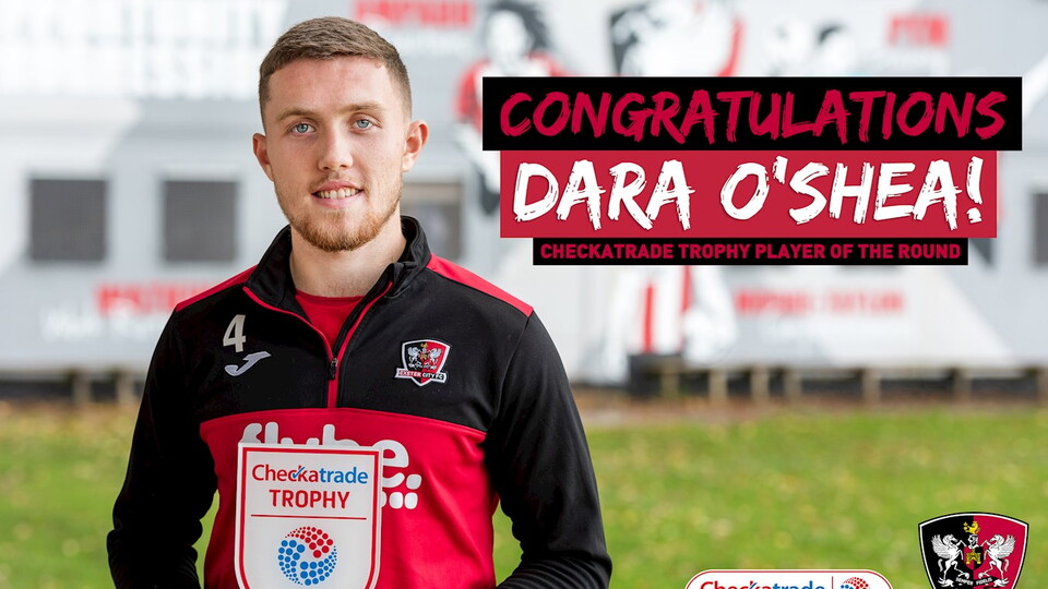 The accolade, which covers all three of the group games, was presented to Dara for his sterling performances against Yeovil Town, West Ham United under-21s and Bristol Rovers which saw the Grecians keep three clean sheets and qualify for the knockout stages by winning the group.