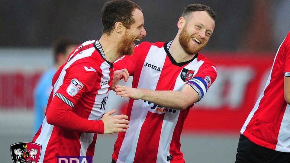 Exeter City: Pym, Sweeney, James, Archibald-Henville, Tillson, Harley, Holmes (Boateng, 80), Stockley, Seaborne (Woodman, 45), Moxey, Taylor