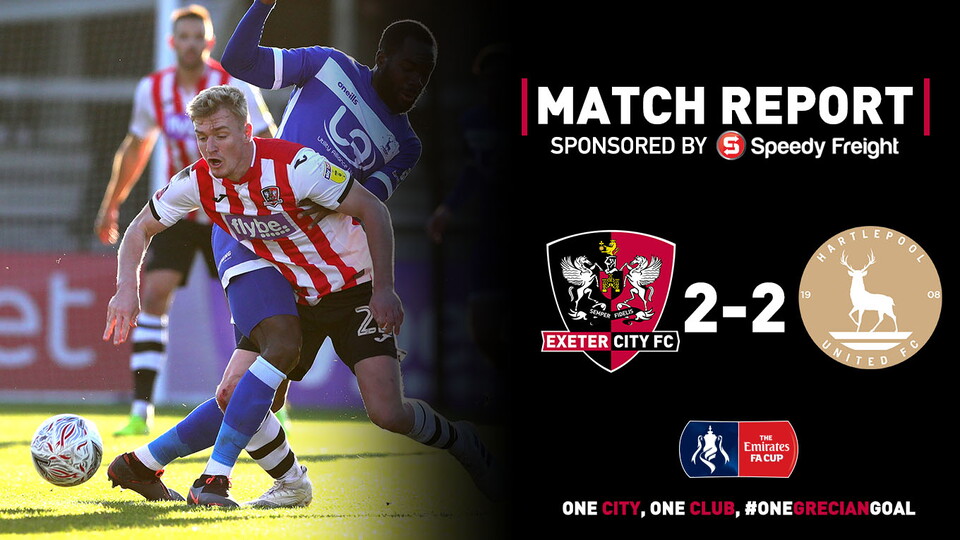 Exeter City gave away a two goal advantage in the Emirates FA Cup at home to Hartlepool United.