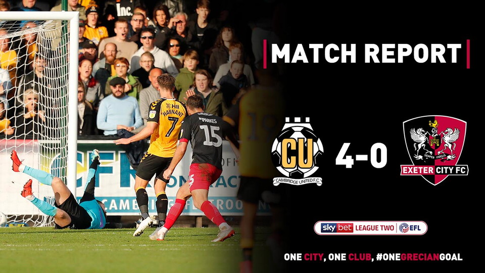 Exeter City fell to a heavy defeat away at Cambridge United as they were beaten by four goals to nil at the Abbey Stadium.