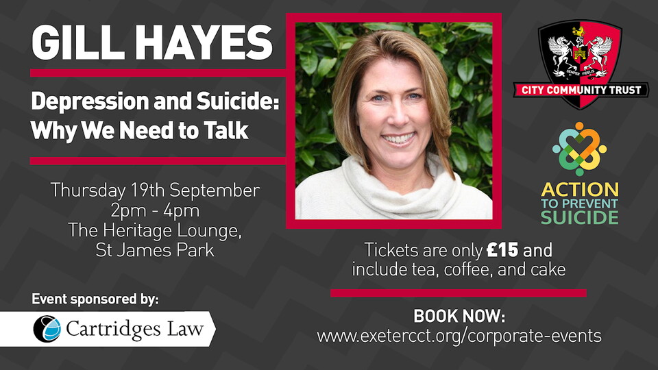 The event, sponsored by Cartridges Law, will feature Gill Hayes talking about depression and suicide: why we need to talk.