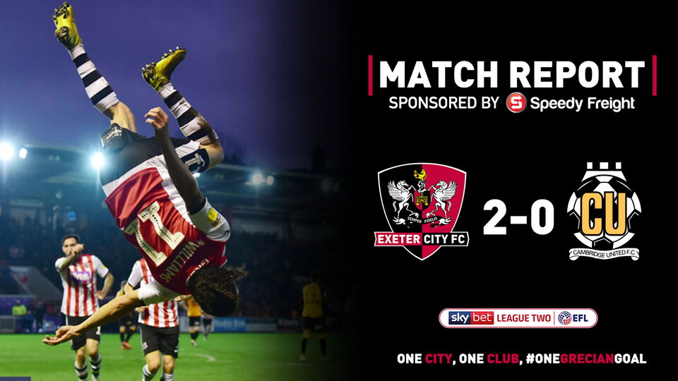 Exeter City extended their unbeaten league home run to seven games with a 2-0 win over Cambridge United at St James’ Park. Ryan Bowman’s close range strike coupled with Randall Williams’ effort meant the Grecians remain within touching difference of leaders Swindon Town at the top of the Sky Bet League Two table.