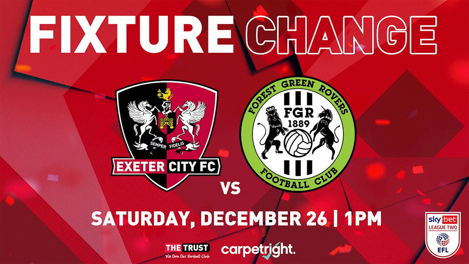 Exeter City's Boxing Day match against Forest Green Rovers at St James Park has been moved from a 3pm kick-off to the earlier time of 1pm.
