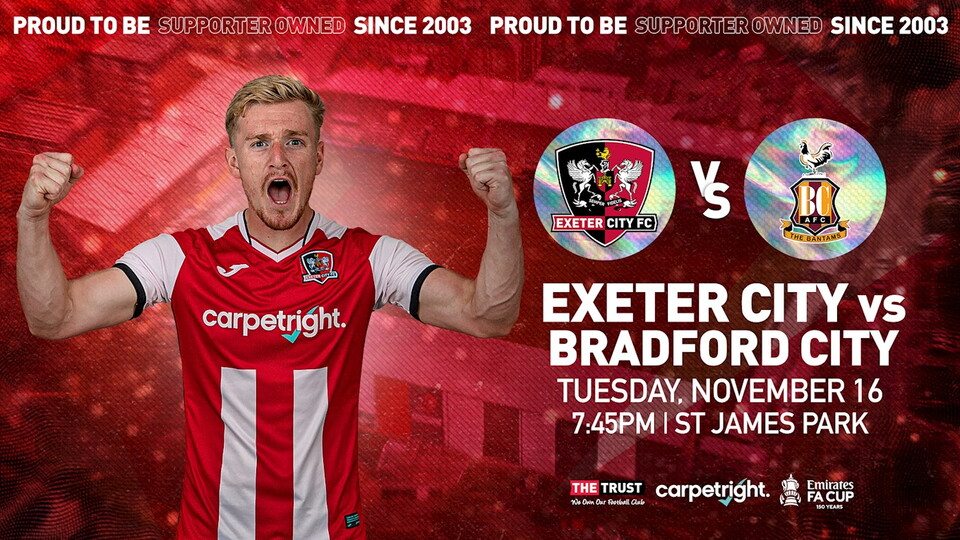 Exeter City are next in action in an Emirates FA Cup first round replay against Bradford City on Tuesday, November 16 in a 7:45pm kick-off.