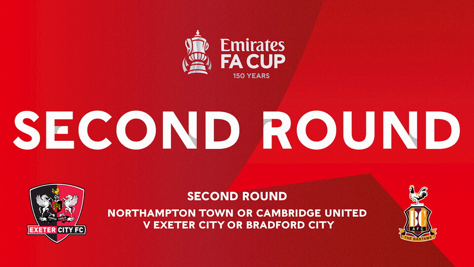 Exeter City will face either Northampton Town or Cambridge United in the second round of the Emirates FA Cup away from home should they progress past Bradford City.